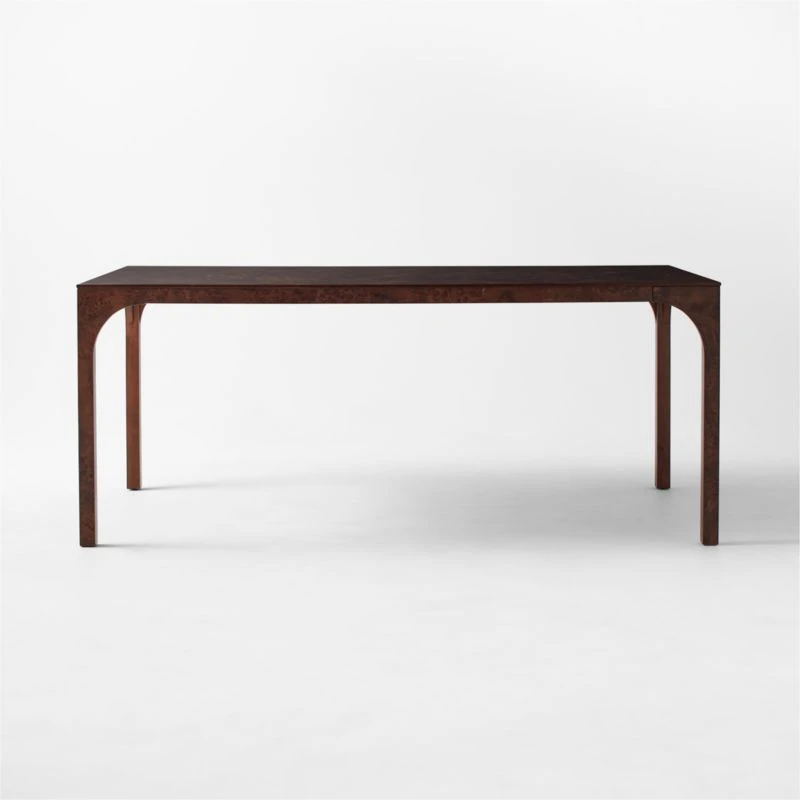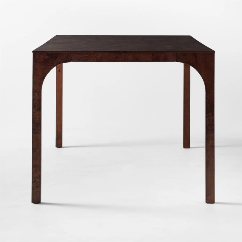 Ancient Roman aqueducts and high-speed trains are the inspiration behind this sleek, lacquered table from Euga Design Studio in Italy. Table flows continuously in dark Mappa burl veneer that nods to a vintage era. Fluid curve of each leg mirrors the sweeping, arched structure of the aqueducts—an architectural foundation for a stretch of Eurail tracks. Comfortably dines six, but will accommodate eight. Learn more about Euga Design Studio on our blog. CB2 exclusive.