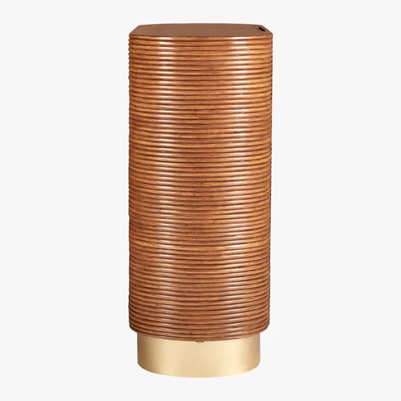 Brett Beldock serves a traditional rattan bar up with a twist. Solid wood frame with rattan core patterned detail stands modern on a brass half moon base. Inside, shelves hold flat bottomed glasses or flip to store wine bottles in divots. CB2 exclusive. Learn about Brett Beldock on our blog.
