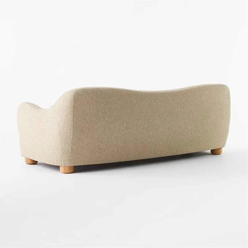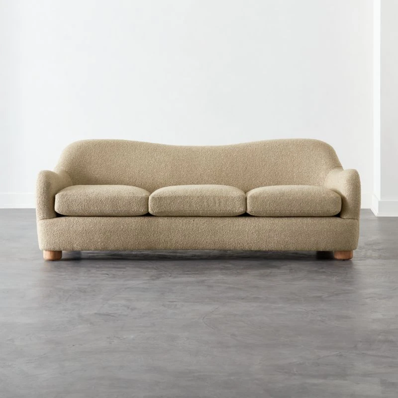 Boucle takes on camel-colored hues in loungeable sofa designed by Ross Cassidy. Bubbly in shape with rounded legs of solid bleached oak and an oversized silhouette made for spreading out. CB2 exclusive.