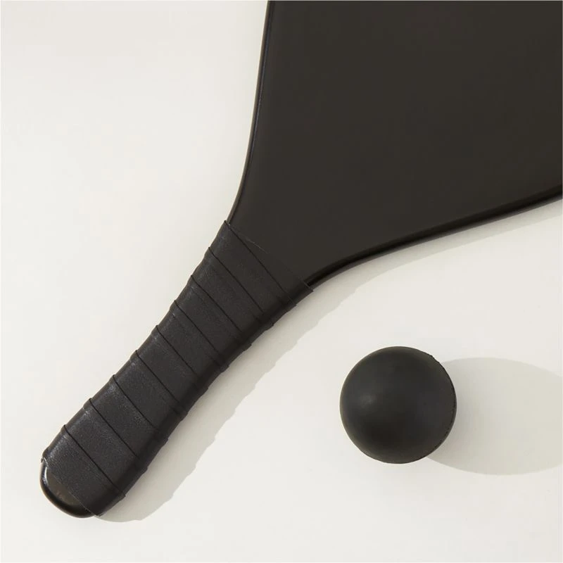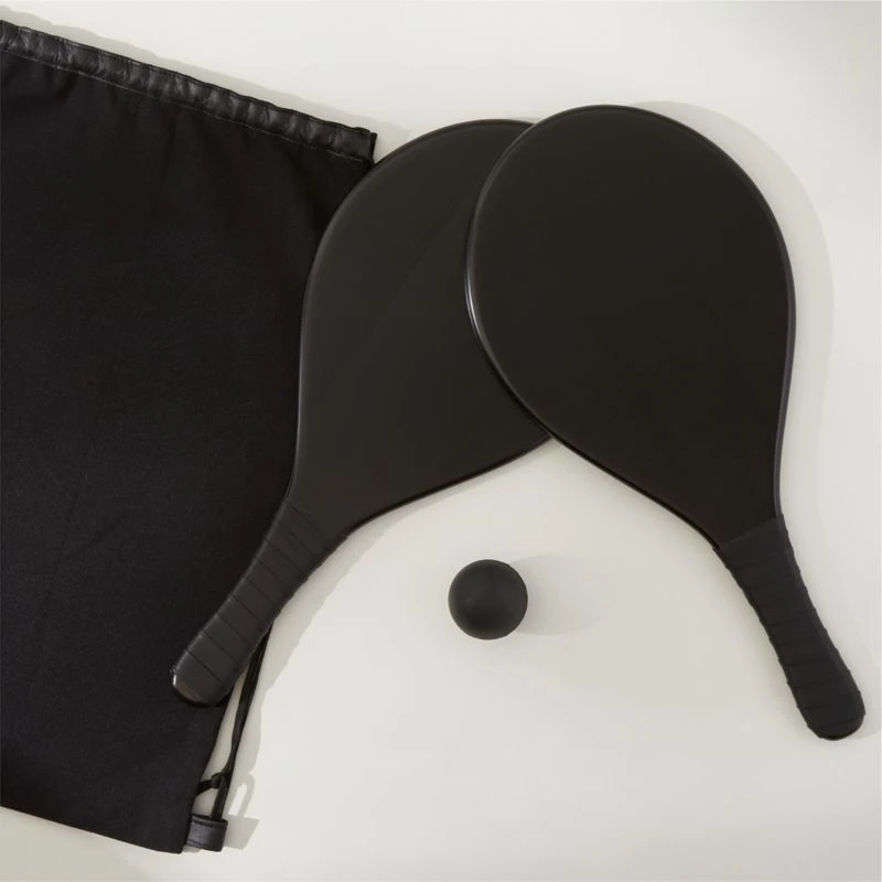 Outdoor paddleball set features two beechwood paddles with leather-wrapped handles and a black rubber ball. Set includes a black canvas drawstring bag that’s perfect for carrying to the beach or park. CB2 exclusive.