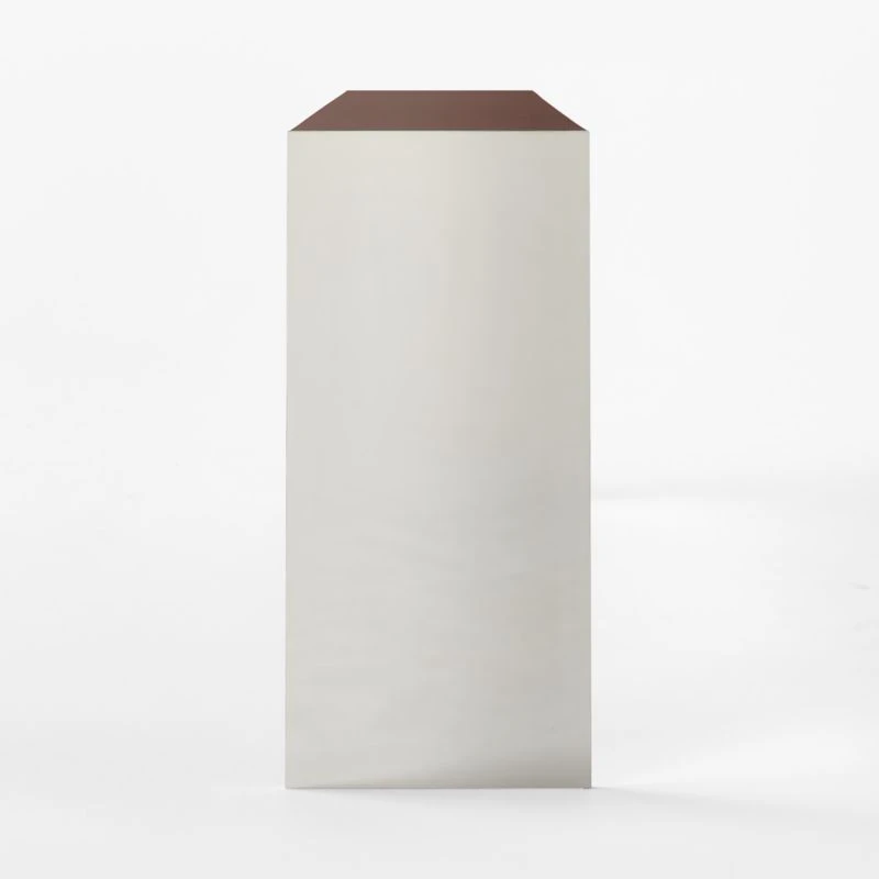 Sleek console table by VUUE gleams from all angles. Minimalist design has echoes of Brazilian modernism due to the chosen materials: polished stainless steel legs and rich acerbity wood. Two drawers are hidden by chamfered edges that create a unified look across the piece. The wood’s exceptionally shiny finish is akin to a French polish, a 19th-century finishing technique developed to accentuate the finest furniture back then and today. CB2 exclusive.