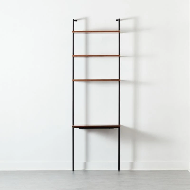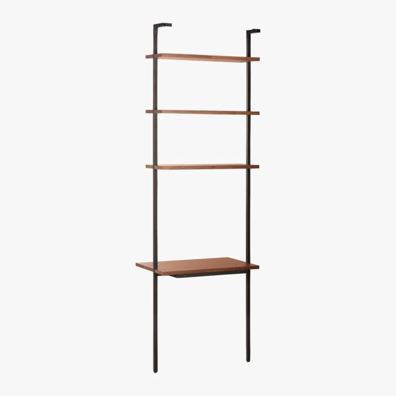 Party on top, business on the bottom. Three fixed walnut veneer shelves pan out in a powdercoated metal frame. Modularly designed to pull double duty as a display/work space and looks even better standing next to our Helix walnut bookcase. Stud mounting recommended; hardware included for drywall installation. CB2 exclusive.