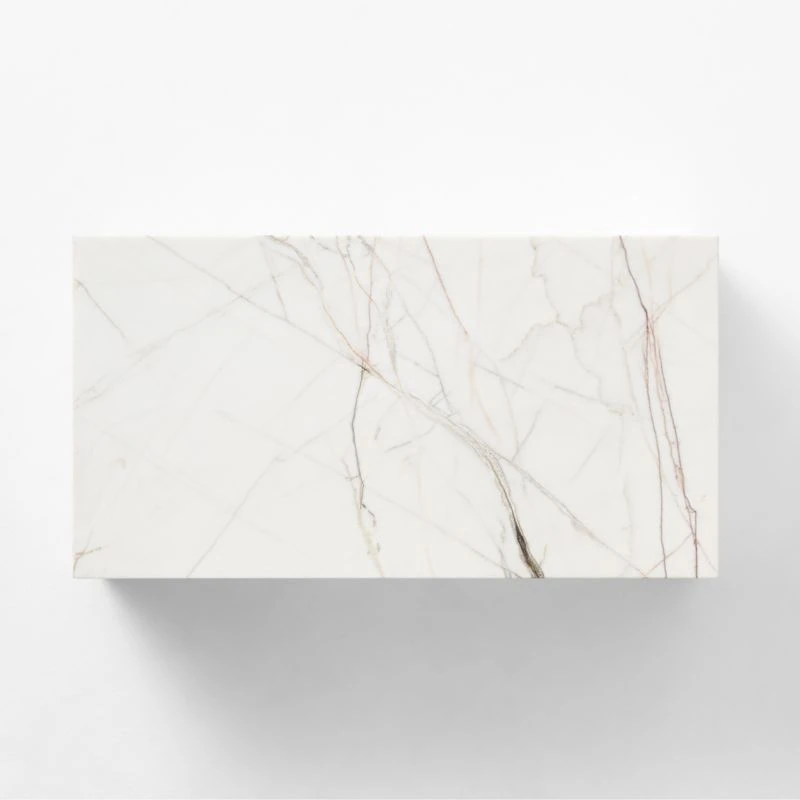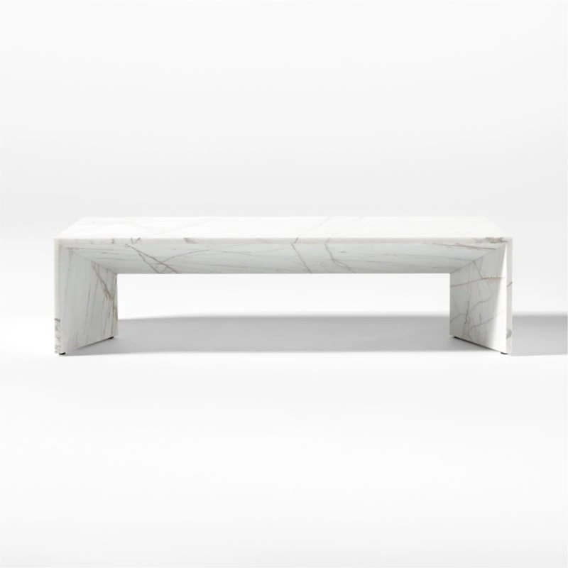 Sleek and refined with mitered construction details throughout, this outdoor coffee table by VUUE is a study in evocative minimalism. Active white marble is highlighted at every angle with its natural variations and intricate veining—a showpiece inside and out.