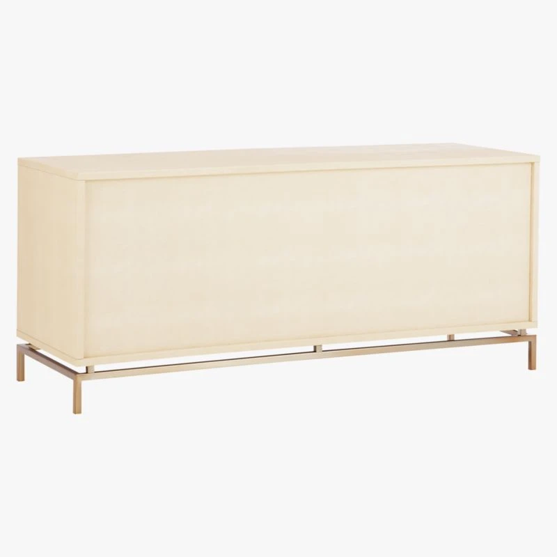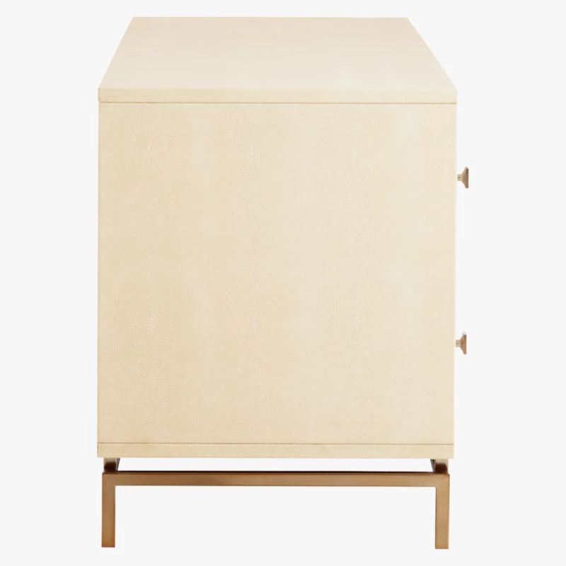 Divine ivory shagreen is boudoir-level luxury on a minimal modern frame. Designed by Amanda Ip of Slate Design, striking low profile dresser is completely wrapped in faux embossed sharkskin-like shagreen, by hand no less. Braced by a slim, open structure brass frame, silhouette is the picture of chic sophistication. Four deep drawers slide effortlessly on metal glides with brass-finished knobs. Learn about Amanda Ip on our blog. CB2 exclusive.