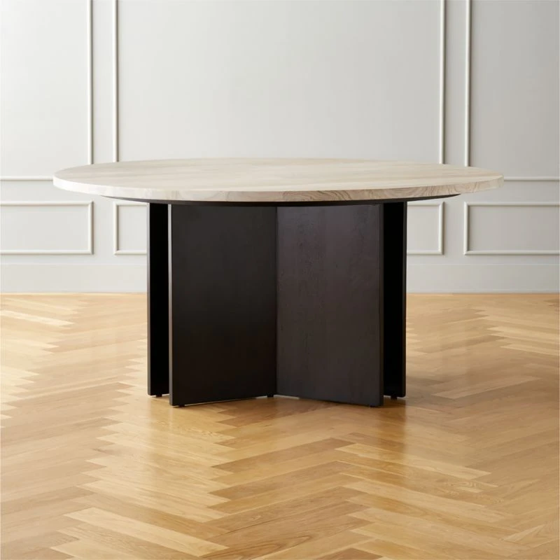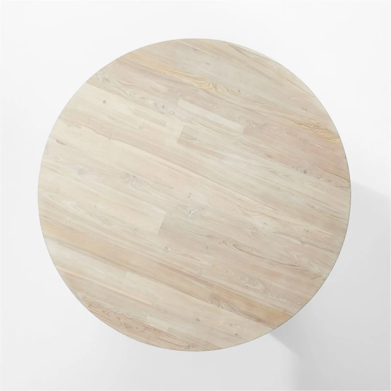 Solid repurposed teak is the star of this round statement dining table. Finished with a subtle white wash and topped with clear lacquer, teak wood retains its natural tones, knots and markings. Mango wood legs, set at a slight angle, are finished with a blackening technique, allowing the natural details of the wood to shine through. Seats six easily. CB2 exclusive.