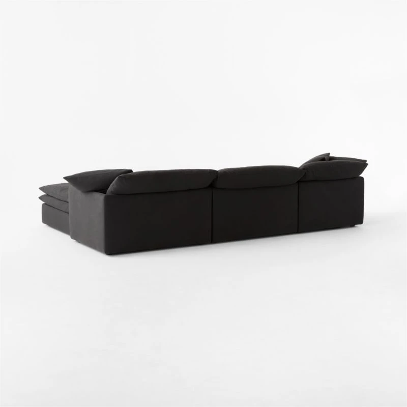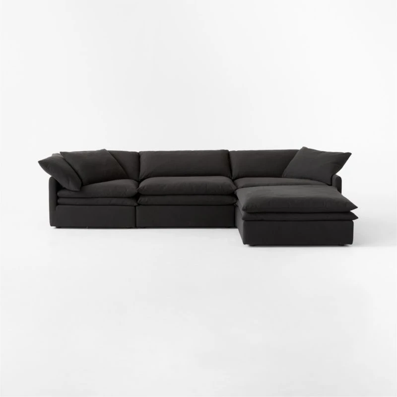 Low, oversized linen sectional sofa is casually chic while maximizing comfort.. Double-stacked pillowy seat and loose cushions throughout are upholstered in a charcoal black easy-care performance linen blend, creating an unbelievably soft place you’ll never want to leave. Combine it with other Mattea pieces to create a sectional to fit your space. CB2 exclusive.