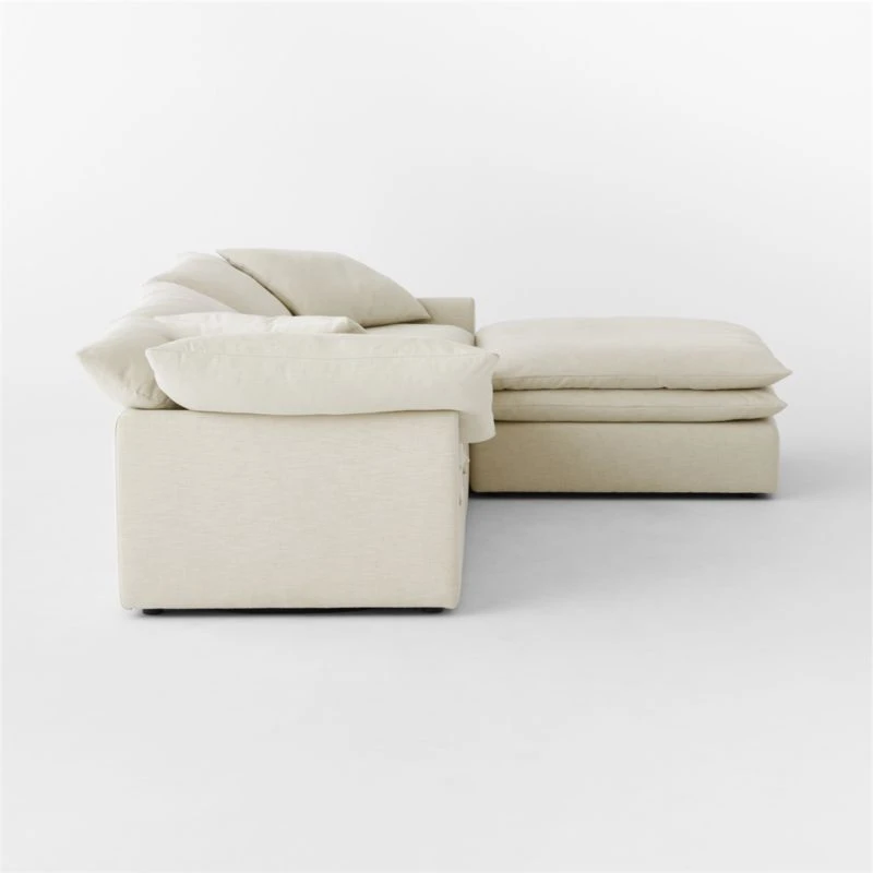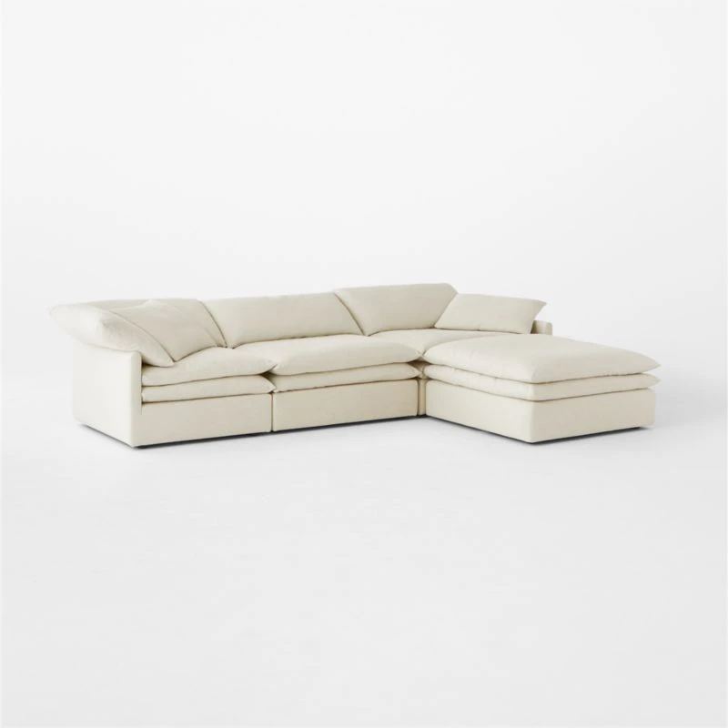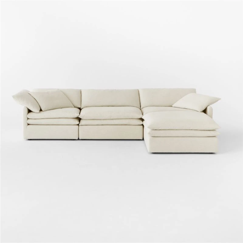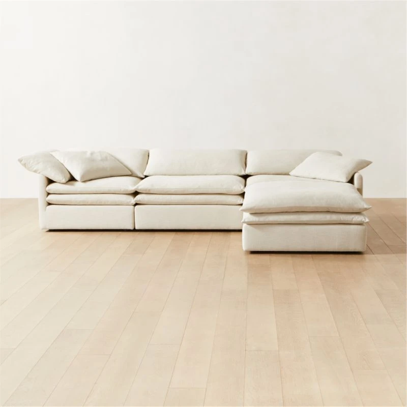 Low, oversized linen sectional sofa is casually chic while maximizing comfort.. Double-stacked pillowy seat and loose cushions throughout are upholstered in a natural-toned, easy-care performance linen blend, creating an unbelievably soft place you’ll never want to leave. Combine it with other Mattea pieces to create a sectional to fit your space. CB2 exclusive.