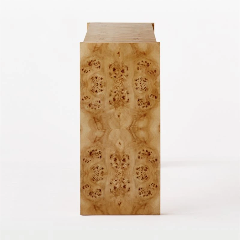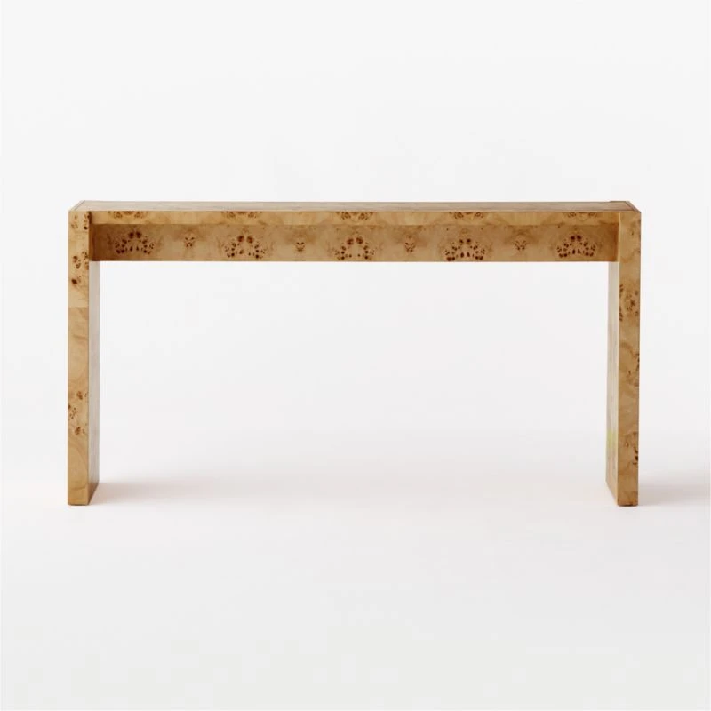 Complemented by clean lines and a minimal design, active burl wood veneer is the star of this console table designed by VUUE. Thick rectangular legs stand flush with the top, providing structural interest without distracting from the wood’s gorgeous swirling grain. CB2 exclusive.