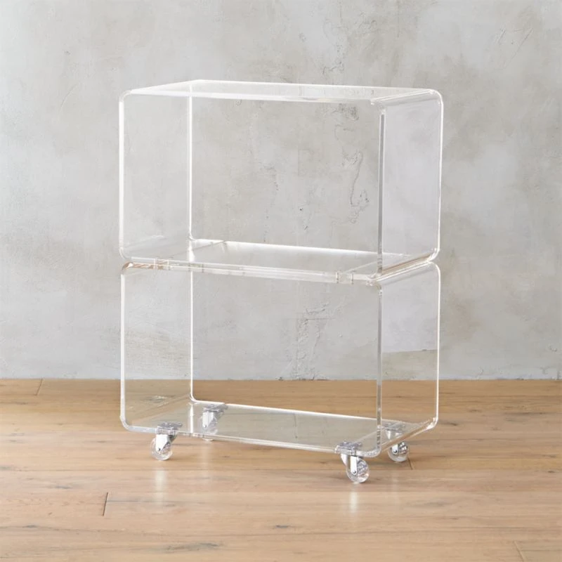 Transparent two-tier nook floats in the room without taking up permanent visual residency. Thick molded acrylic adds clean mod edge in one seamless turn top/bottom. Clear acrylic casters roll room to room. peekaboo acrylic rolling two shelf is a CB2 exclusive.