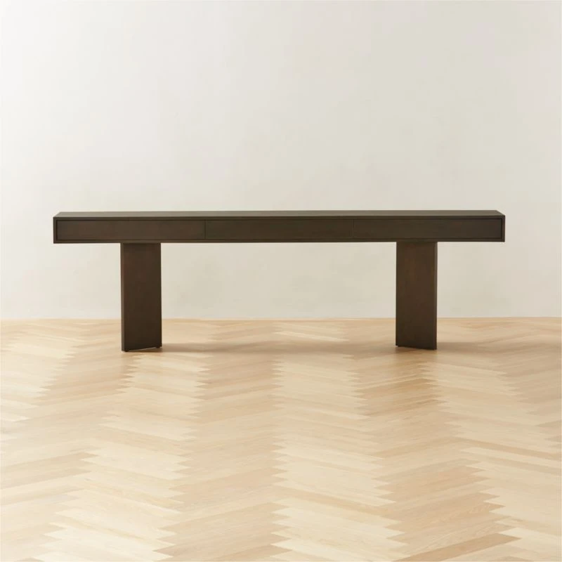 Deceivingly simple at first glance, elongated console table by Studio Anansi explores the possibilities of proportion. The wood frame is fully clad in copper-finished aluminum sheeting to create a slight shimmer when the light hits it just right. It features push-to-open drawers to help maintain order. CB2 exclusive.