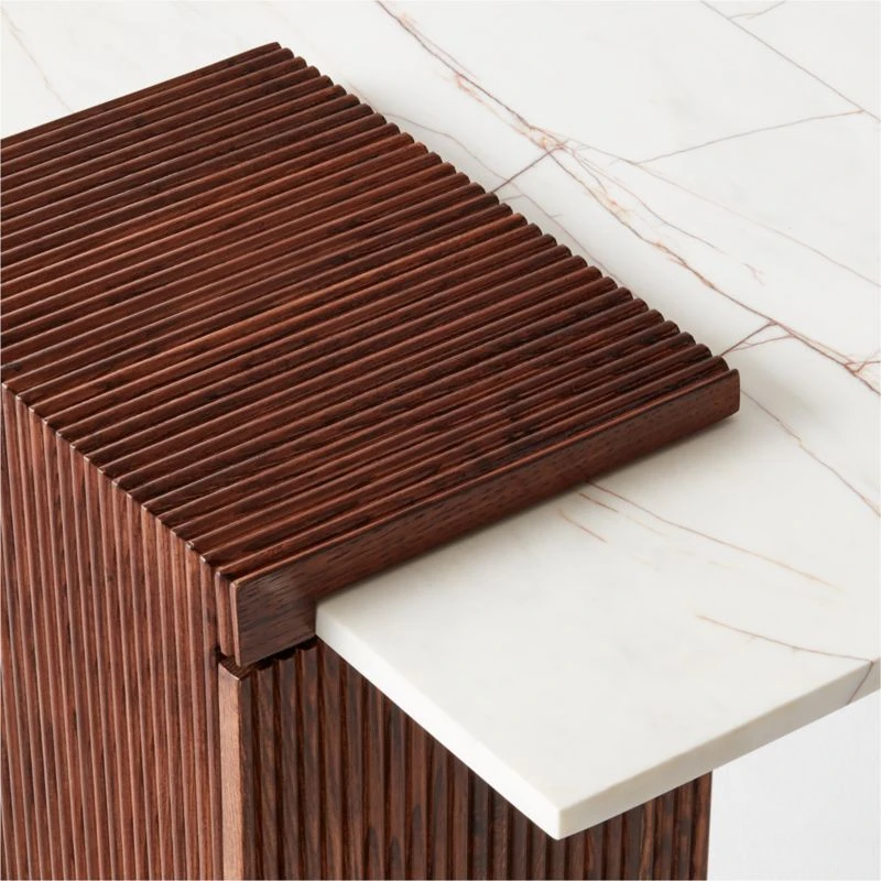 Sculptural desk by Barcelona-based Mermelada Estudio is handcrafted of super-active Italian white marble with fracture lines in a warm bronze tone that are unique to each piece. Two reeded ash wood cabinets serve as pedestal bases, offering a rich counterpoint to the smooth marble top. CB2 exclusive.