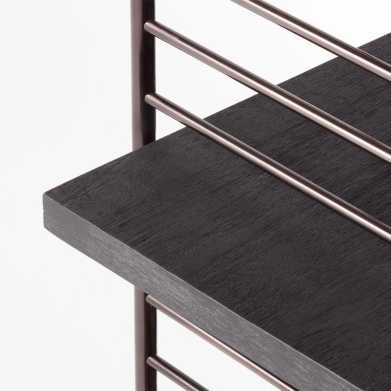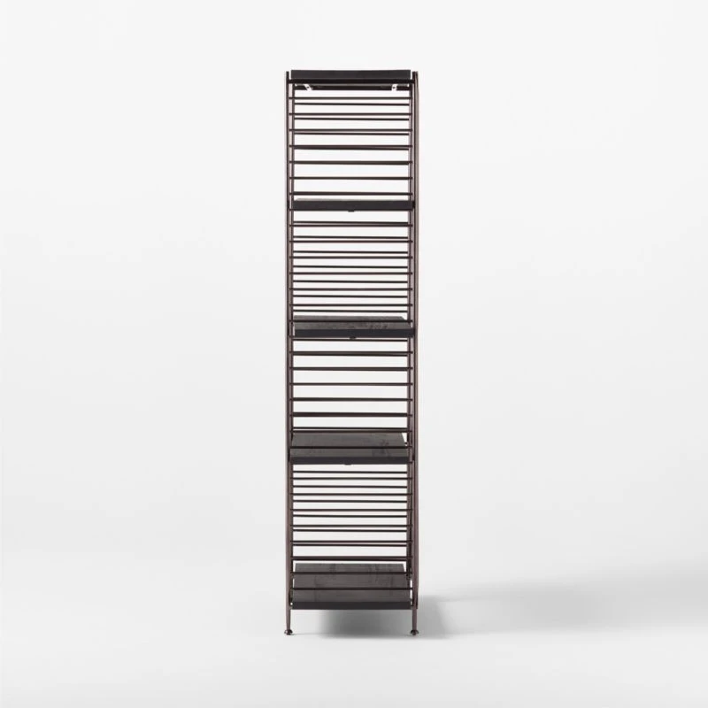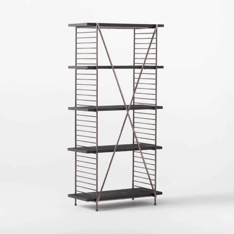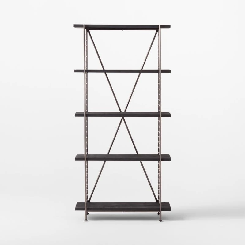 Shelves wirebrushed for texture and finished with a black stain, open bookshelf designed by VUUE suspends books, photos and artwork on a black iron tubing frame. Three adjustable shelves rest in the middle while the top and bottom stay fixed. CB2 exclusive.