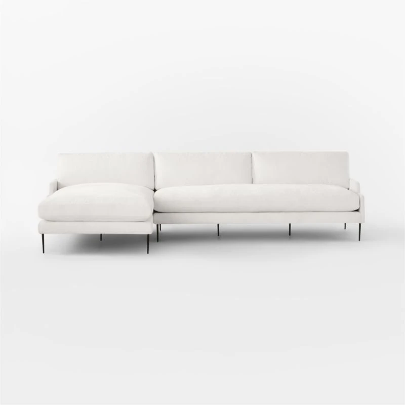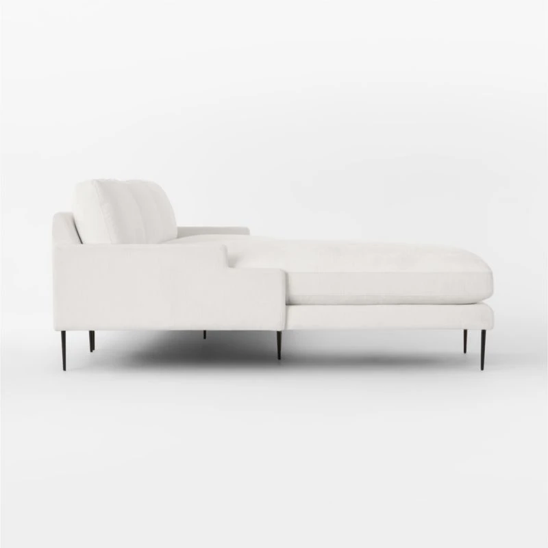 Chaise sectional sofa by Mermelada Estudio feels traditional at first, but upon closer inspection reveals modern sensibilities—like thin profile arms and a sleek silhouette. Tall, needlelike metal legs finished in a lustrous black powdercoat create graphic contrast with white upholstery. CB2 exclusive.