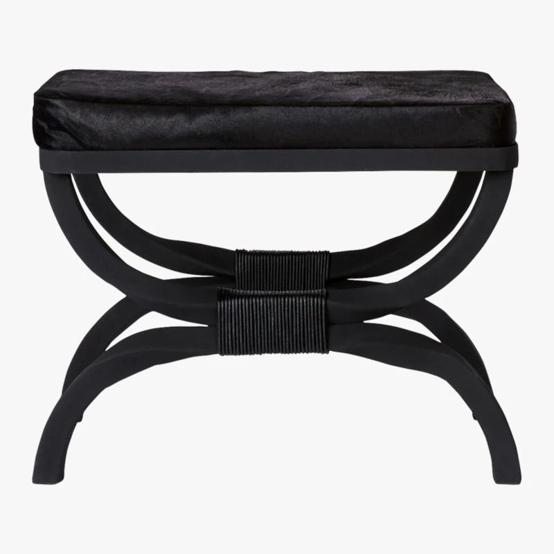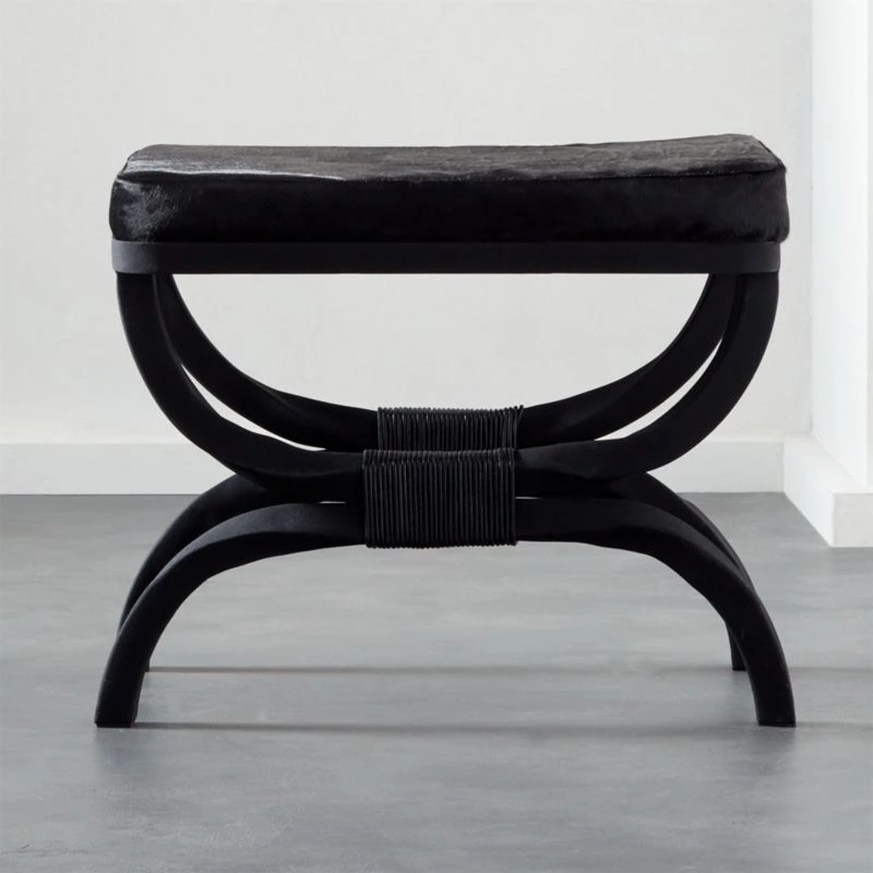 Cloaked in all black, modern stool reigns with traditional Louis XVI style. Elegant mild steel legs curve in matte black, slightly wider than their predecessors. Genuine cowhide-covered seat offers a solo spot in the entry or living room. Or pair two together in front of a fireplace or at the end of the bed for a grander statement. Learn more about Brett Beldock on our blog. CB2 exclusive.