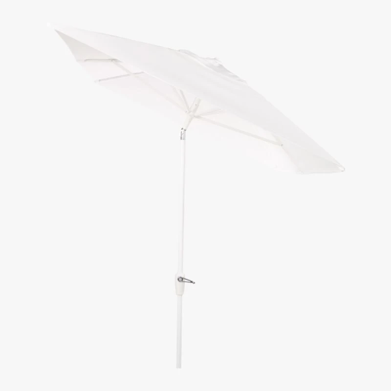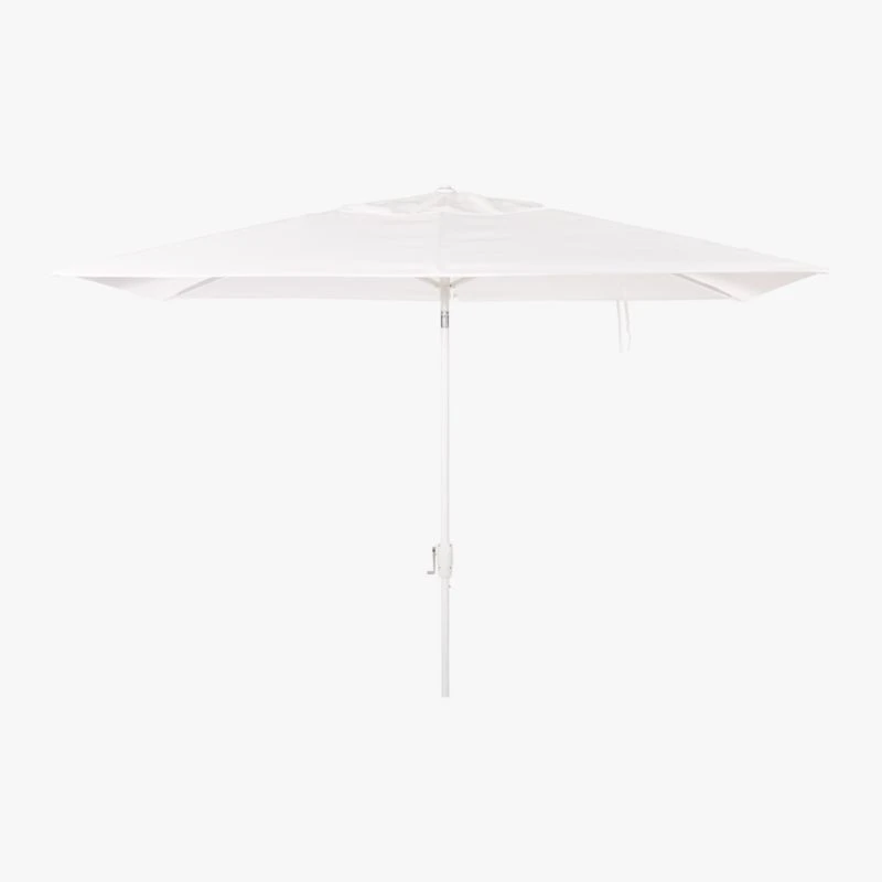 Pop open a modern shade in pure white. Hi-gloss white powdercoated aluminum pole is rust-resistant. Rectangular polyester umbrella shade can raise/lower as need be. Fits perfectly inside our outdoor dining tables or next to a sun lounger. CB2 exclusive.