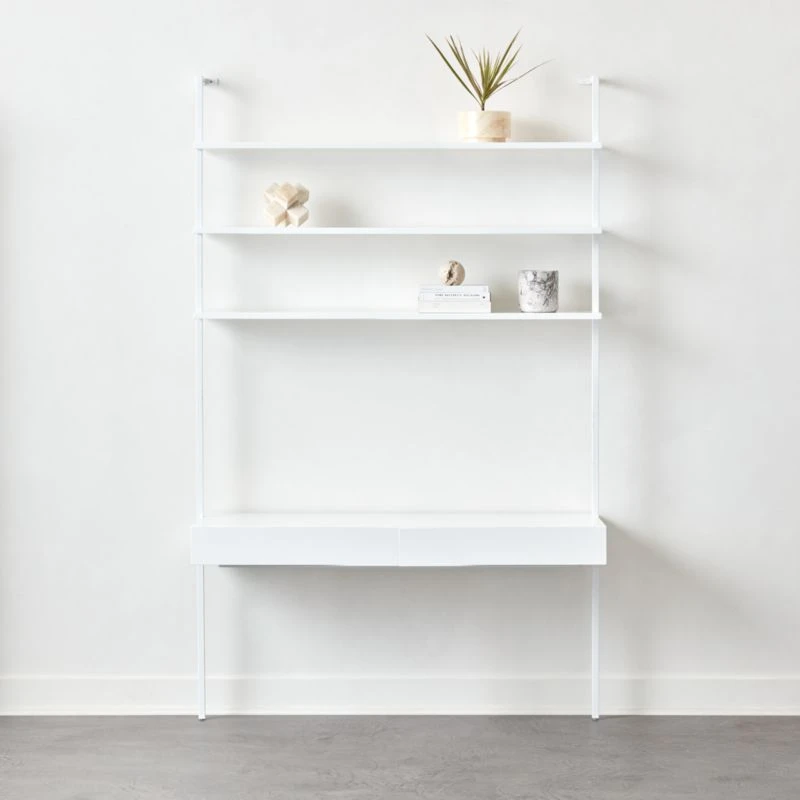 Our best seller goes wide for a sleek, minimalist office space. Three shelves ladder up in glossy white engineered wood while a powdercoated aluminum frame hides hardware expertly. Mounts sturdy to the wall with two push-to-open drawers for extra storage. CB2 exclusive.