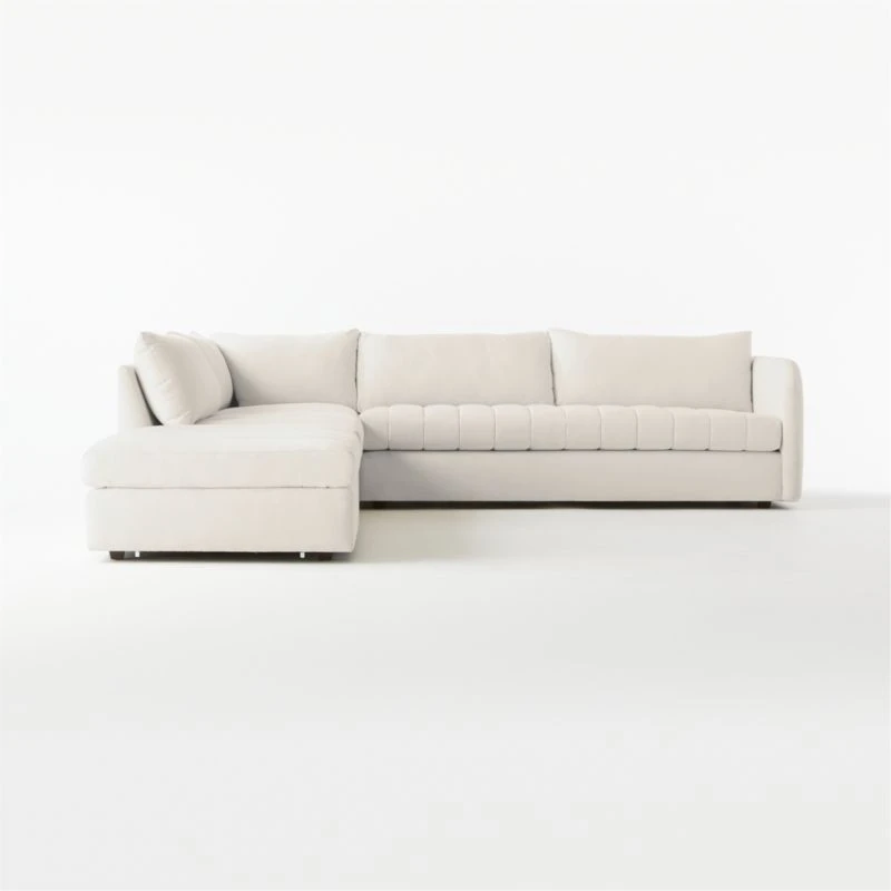 Channel-stitched seat cushions are paired with clean, simple back cushions for a domestically crafted sectional sofa that’s big on both comfort and style, all upholstered in natural cotton. “I’m all about the lounge,” confesses designer Kara Mann. “So a really comfortable sofa is essential. This collection features a softer take on upholstery in general: a little deconstructed, a little bit more casual.” CB2 exclusive.