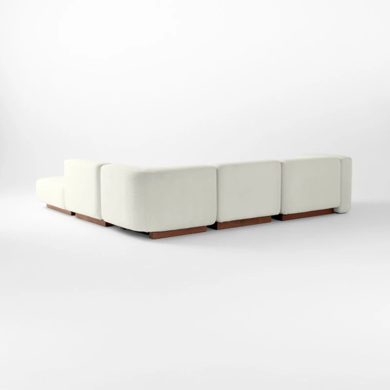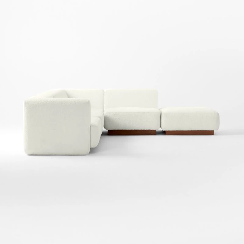 Designed by Lawson-Fenning, the Terrain furniture collection consists of modular pieces that can be arranged to create different environments. Sectional sofa features plush bouclé upholstery. Walnut base, certified sustainable by the Forest Stewardship Council ®, reveals warm tones and striations that vary from piece to piece. Includes left-armed chair, two armless chairs, corner chair and ottoman that come together as one. CB2 exclusive.