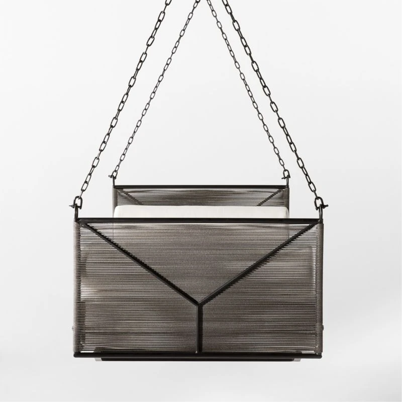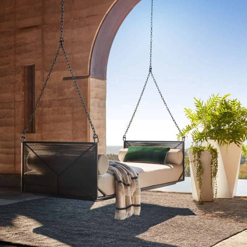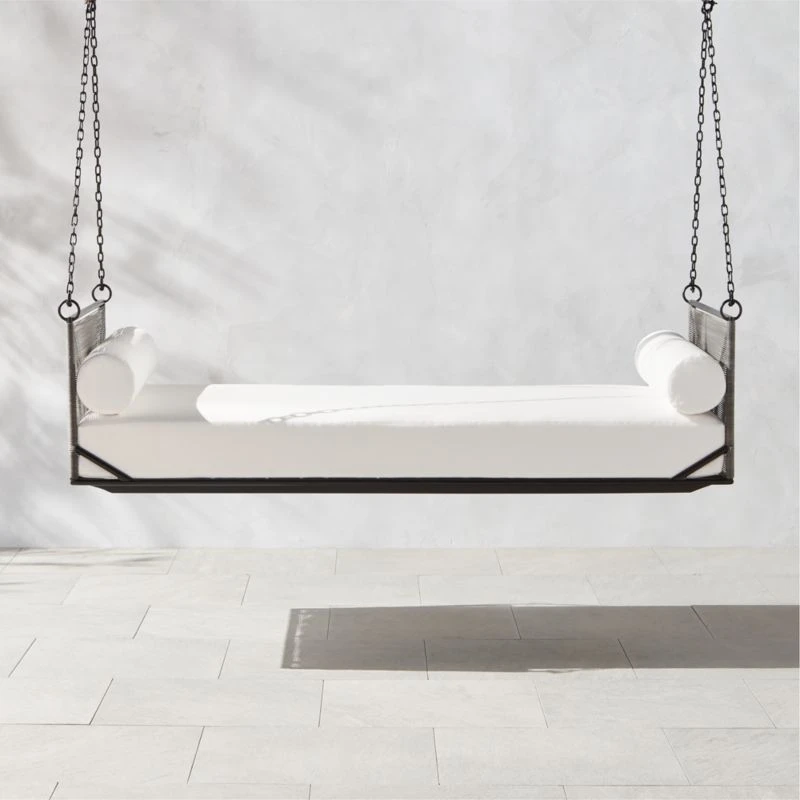 A suspended daybed creates a perch for whiling away the hours. Brett Beldock-designed daybed is inspired by simple industrial architectural shapes and executed in outdoor-friendly materials. Black aluminum frame is wrapped in all-weather rattan, then accented by a Sunbrella ® performance white cushion and coordinating bolster pillows for a stunning combination. CB2 exclusive.